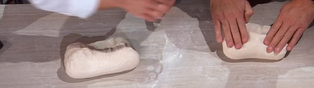 Dividiamo l’impasto in due parti uguali. Allarghiamo leggermente sul piano, in modo da creare un rettangolo. Ripieghiamo i due lati verso il centro, quindi lo ripieghiamo in senso opposto, fino a formare un filone.