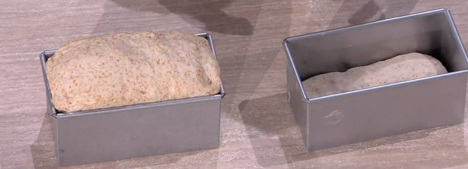 Inseriamo l’impasto all’interno di uno stampo per pane in cassetta ben oliato. Schiacciamo bene, copriamo e lasciamo riposare fino a quando l’impasto raggiunge il bordo dello stampo.
