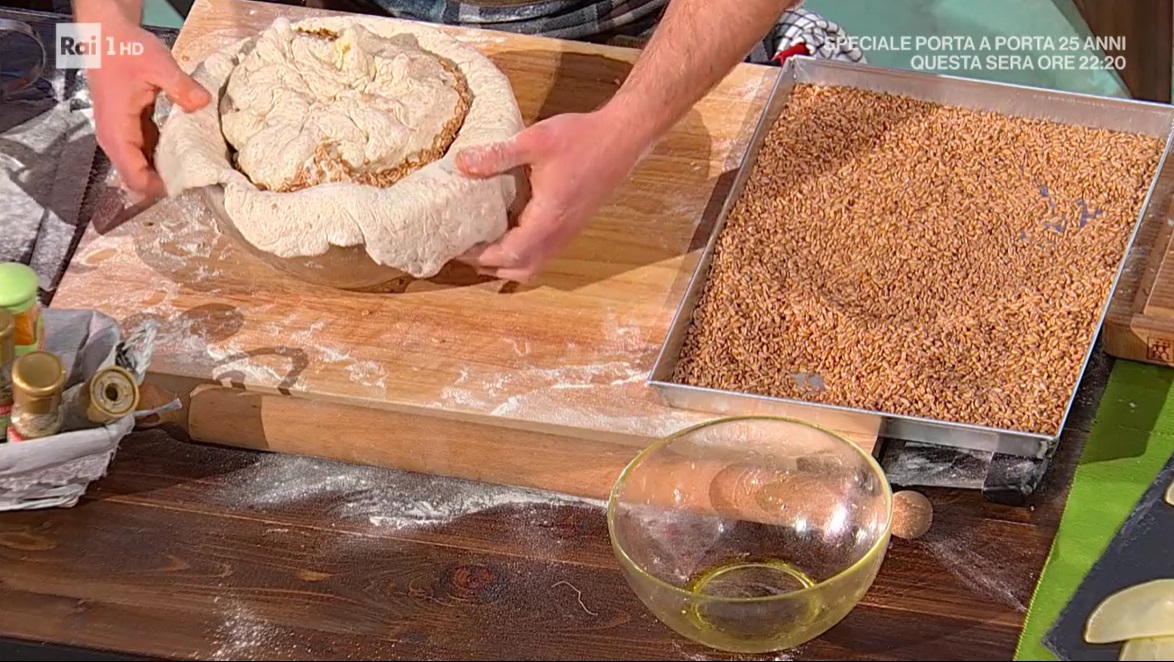 Prendiamo la pagnotta più grande e la allarghiamo sul piano infarinato, con il mattarello, fino ad ottenere un disco spesso circa 1 cm. Foderiamo la ciotola (della lievitazione) con il disco ottenuto, passiamo l’altra pagnotta (più piccola) nei chicchi di farro reidratati (in modo da ‘impanarla’) e la inseriamo dentro la ciotola foderata con l’impasto. Avvolgiamo la pagnotta con il disco di pasta e la capovolgiamo sulla teglia. Incidiamo in superficie e cuociamo subito in forno caldo e statico a 250° per 45 minuti; gli ultimi 10 minuti, socchiudiamo il portello del forno.