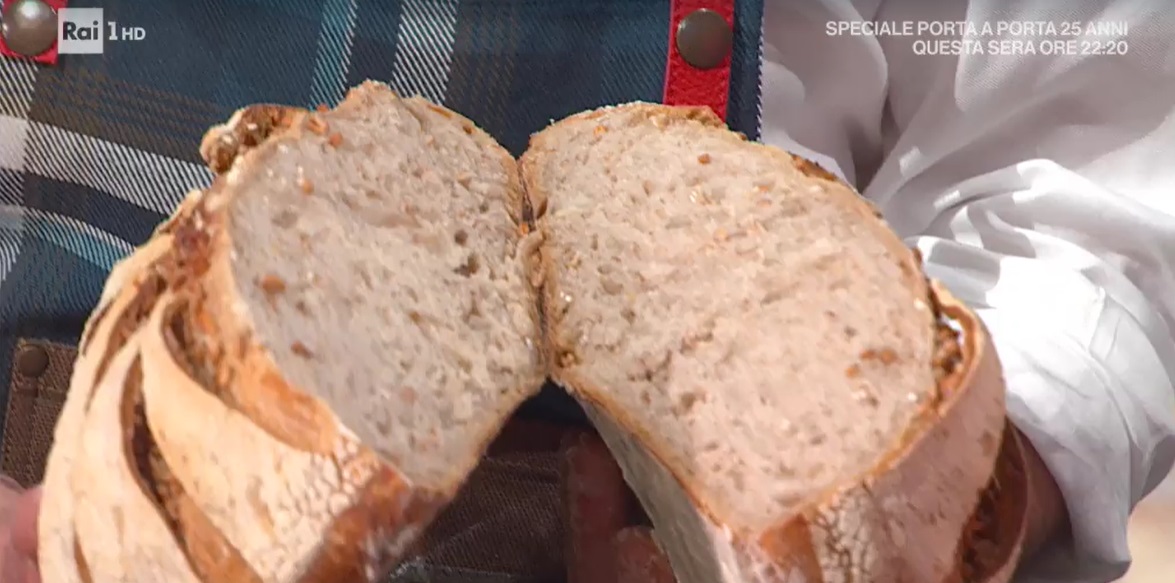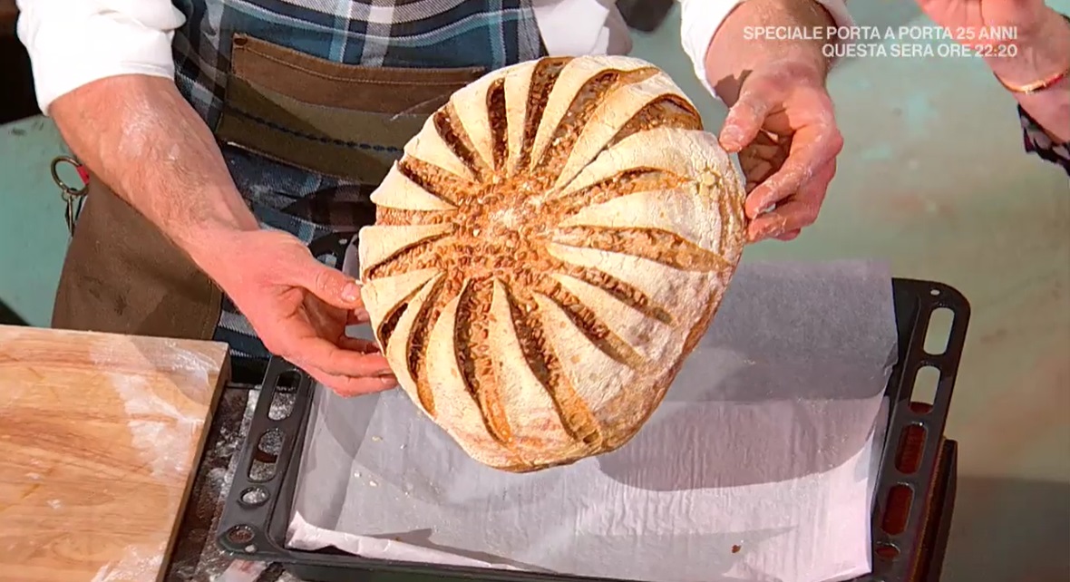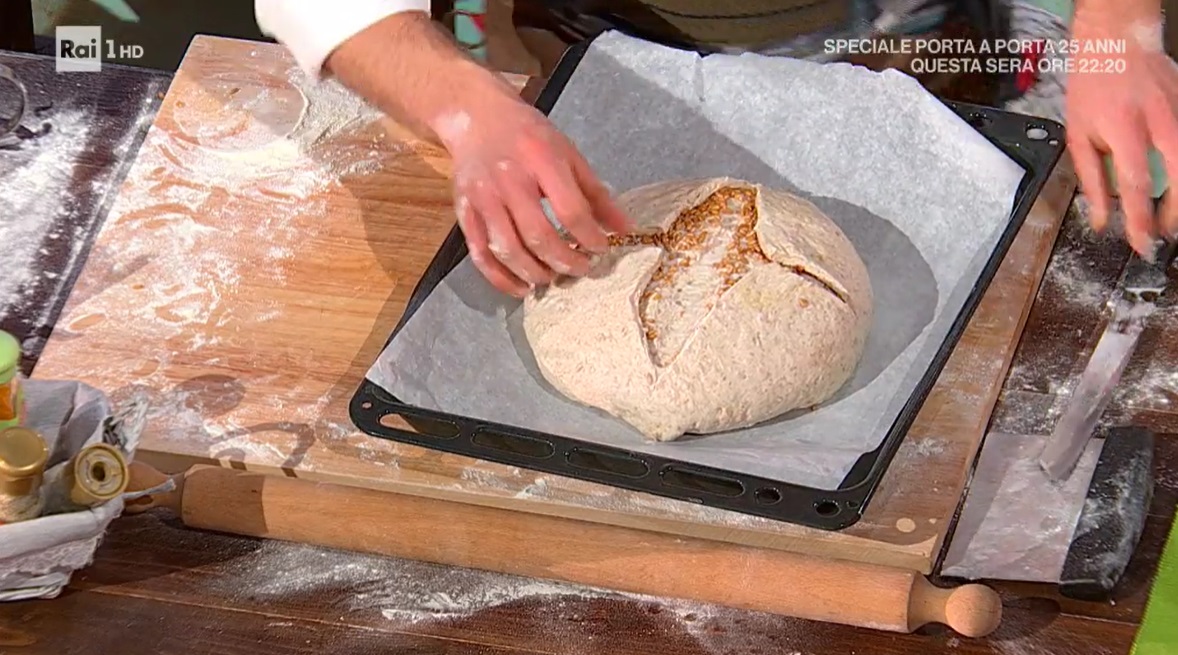 - 200 g farina tipo 2, 200 g segale integrale, 200 g farro bianco, 200 g farina integrale di grano tenero, 200 g sfarinato di grano duro, 200 g chicchi di farro, 300 g lievito madre, 700 g acqua, 22 g sale