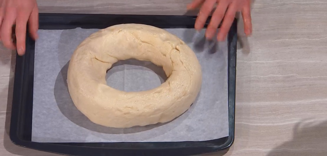 Allarghiamo l’impasto con le mani, dando la forma di un rettangolo spesso. Lo arrotoliamo su se stesso, dando la forma di un filone. Lo allunghiamo su se stesso, formando un lungo filone. Ungiamo con abbondante olio uno stampo da ciambella ed inseriamo all’interno il filone. Copriamo e lasciamo lievitare ancora 2 ore a temperatura ambiente.