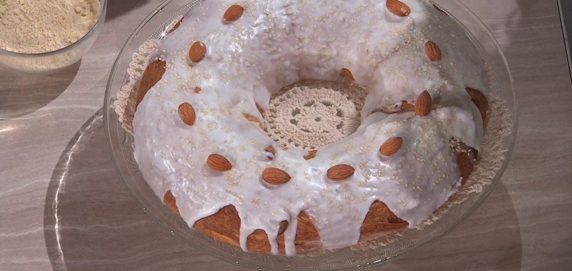 Prepariamo la glassa mescolando l’albume con lo zucchero a velo. La coliamo sulla ciambella (si allargherà da sola) e decoriamo da subito con semi di sesamo e mandorle intere. Lasciamo asciugare.