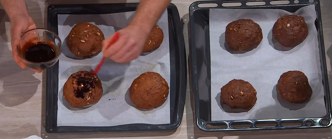 Spennelliamo con altro mosto cotto e cuociamo in forno caldo e statico a 200° per 15 minuti. All’uscita dal forno, li spennelliamo con altra sapa e spolveriamo con zuccherini colorati.