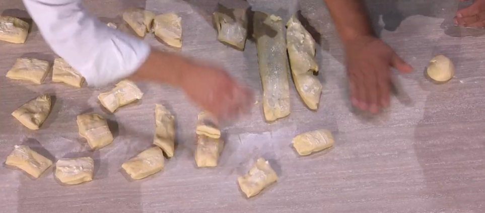 Allarghiamo l’impasto sul piano, in modo da formare un rettangolo spesso circa 3-4 cm. Dividiamo in 7 strisce e su ognuna spalmiamo il burro rimasto. Tagliamo ogni striscia in pezzetti e, ogni pezzetto, lo ripieghiamo su se stesso, chiudendo il burro all’interno della pallina ottenuta. Disponiamo le palline all’interno di una pirofila imburrata, ben strette. Copriamo e lasciamo lievitare ancora fino al raddoppio.