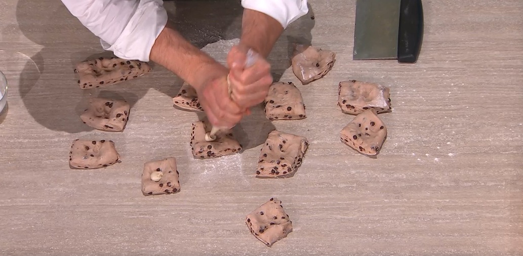 Allarghiamo l’impasto sul piano, con le mani, ad uno spessore di circa 1-2 cm. Ritagliamo 12 quadratoni. Su ognuno, mettiamo un cucchiaino di crema al cioccolato bianco (o alla nocciola). Ripieghiamo l’impasto sulla crema, creando delle sfere lisce.