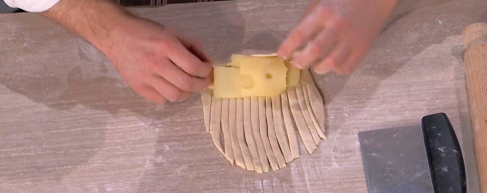 Stendiamo ciascun panetto con il mattarello, formando un disco sottile. Su una metà mettiamo il prosciutto affettato e del formaggio a fettine. Tagliamo l’altra parte dell’impasto a striscioline, formando una frangia. Arrotoliamo l’impasto sul ripieno, partendo dal lato ancora integro (foto).