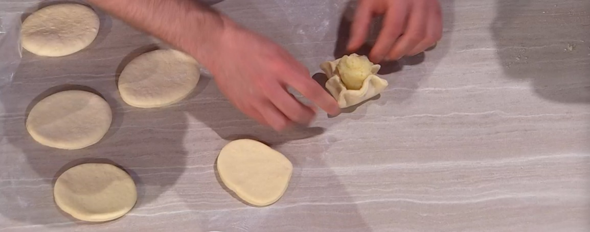 Stendiamo l’impasto con il mattarello, ad uno spessore di circa 1 cm. Ritagliamo dei dischi larghi circa 10 cm. Su ognuno, mettiamo una pallina di ripieno di patate, quindi pizzichiamo l’impasto di pane intorno al ripieno (foto). Disponiamo i panini su una teglia, copriamo e lasciamo riposare per mezz’ora. Spennelliamo con uovo sbattuto con poca acqua e cuociamo in forno caldo e statico a 180° per 25 minuti.