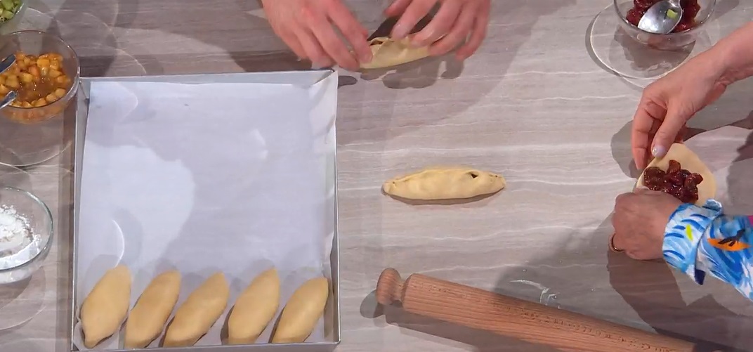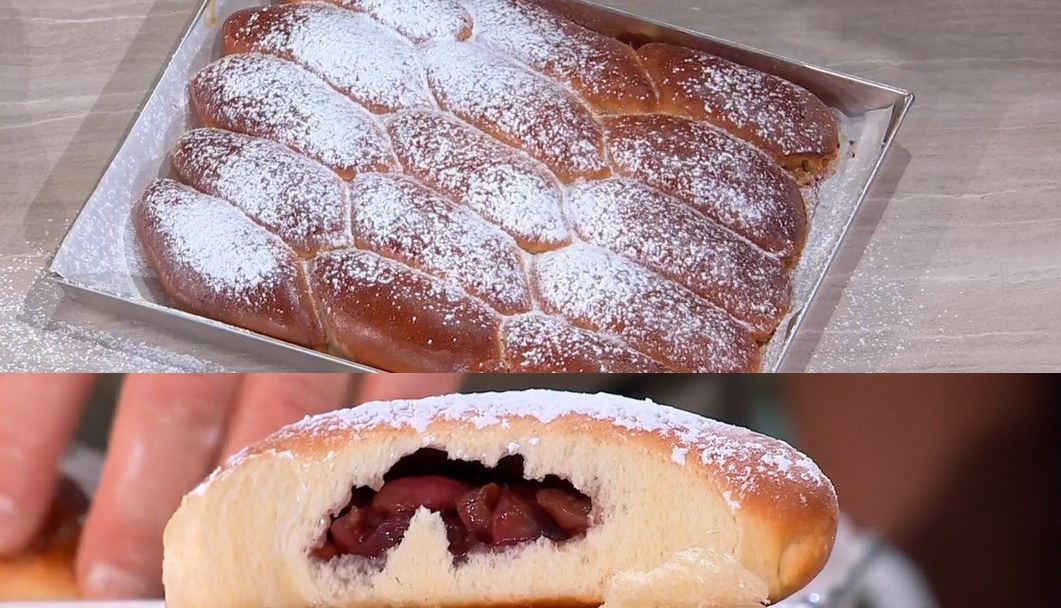 Con il mattarello, stendiamo ciascuna pallina, in modo da ottenere delle lingue sottili circa 3-4 mm. Al centro di ognuna mettiamo un cucchiaio di frutta, quindi ripieghiamo l’impasto sul ripieno, pizzicando bene i bordi. Disponiamo i paninetti ottenuti su una teglia, ad 1 cm di distanza circa. Copriamo e lasciamo lievitare fino al raddoppio (dovranno unirsi e riempire la teglia).