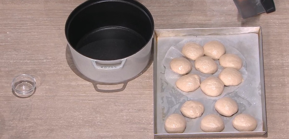Trasferiamo l’impasto sul piano, lo allarghiamo leggemente e lo dividiamo in panetti da 70 g circa. Creiamo delle palline lisce, pirlandole con le mani. Le disponiamo su una teglia con carta forno, vicine, lasciando 1 cm tra l’una e l’altra. Copriamo con pellicola e lasciamo riposare per 1 ora e mezza a temperatura ambiente.