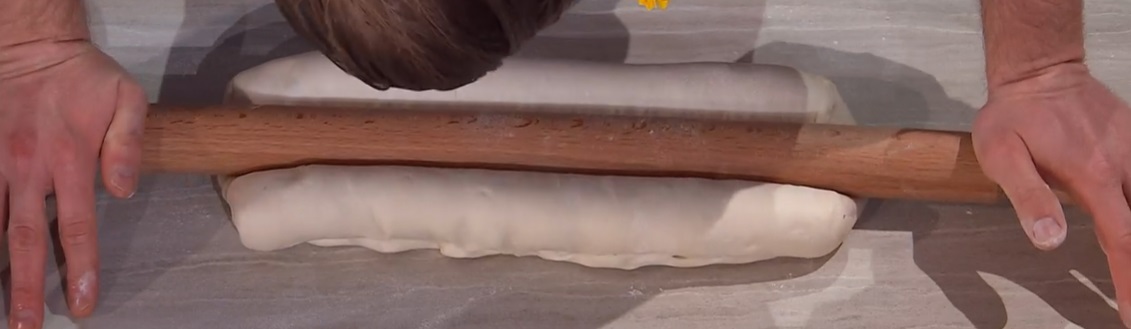 Allarghiamo l’impasto sul piano infarinato, con il mattarello, in modo da ottenere un rettangolo spesso 2 cm. Ripieghiamo a portafoglio, in modo da ottenere un filone. Lo schiacciamo leggermente con il mattarello, quindi lo mettiamo su una teglia, copriamo e lasciamo lievitare ancora 20 minuti.