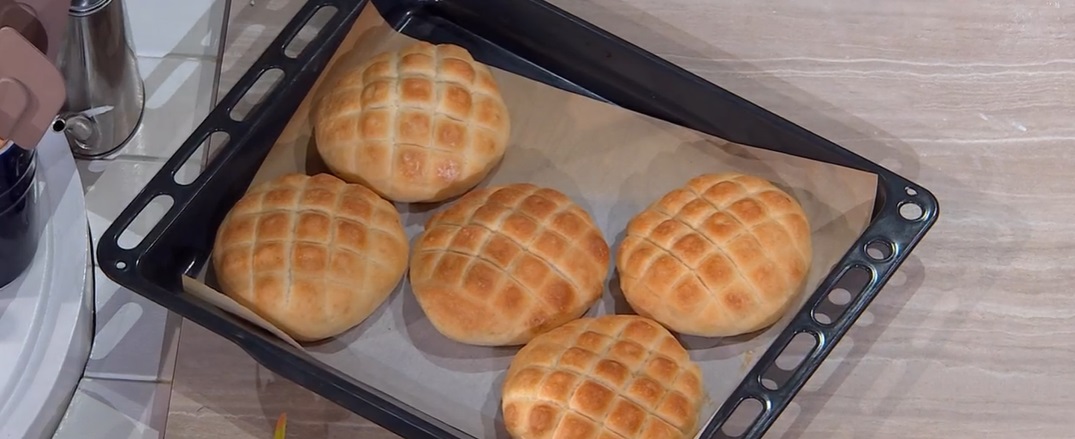 Dividiamo l’impasto in 6 parti uguali, che ripieghiamo su loro stesse, formando delle pagnottine lisce. Le disponiamo su una teglia, le copriamo e le lasciamo lievitare 1 ora a temperatura ambiente.