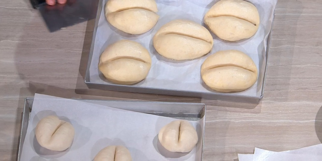 Dividiamo l’impasto in panetti da 100 g, che disponiamo su una teglia. Lasciamo riposare per 20 minuti. Dopo il riposo, arrotondiamo ciascun panetto, roteandolo con le mani sul piano. Disponiamo le sfere su una teglia e, con un tarocco o il manico di un mestolo pressiamo al centro di ogni panino. Disponiamo su una teglia, copriamo e lasciamo lievitare per 2 ore a temperatura ambiente.