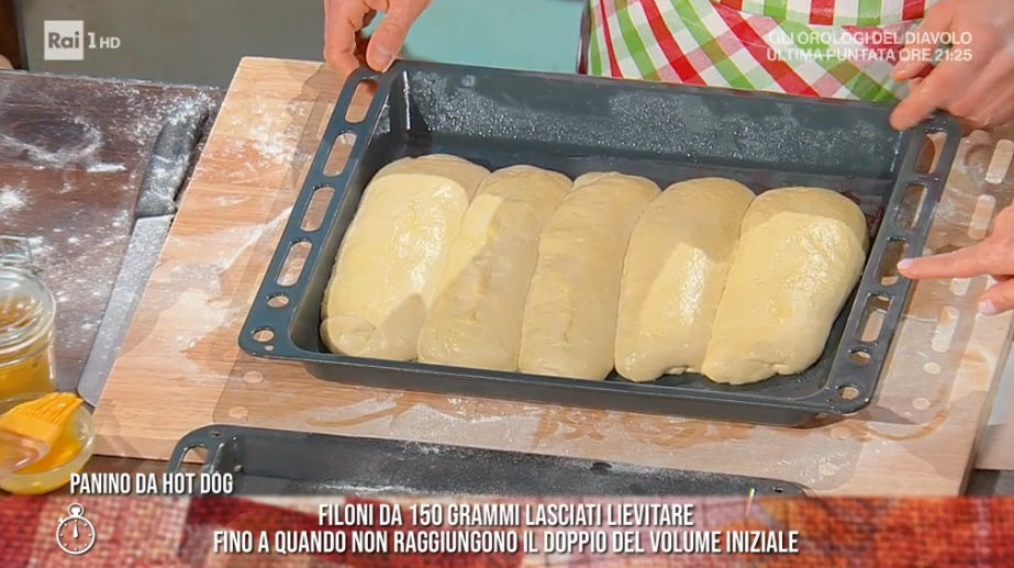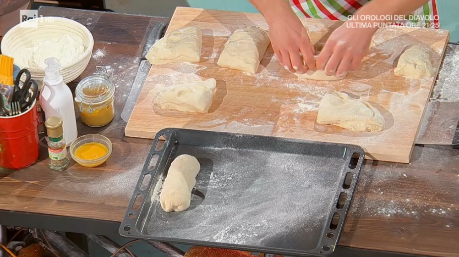 Dividiamo l’impasto in panetti da 150 g circa (ne otterremo circa 6-8) e riepighiamo ognuno su se stesso, in modo da ottenere dei filoncini. Li disponiamo su una teglia con carta forno, ben distanziati, copriamo con un canovaccio e lasciamo lievitare ancora fino al raddoppio del volume (dovranno unirsi, come in foto). Spennelliamo con l’uovo sbattuto e cuociamo i panini in forno preriscaldato e statico a 240° per 10 minuti.
