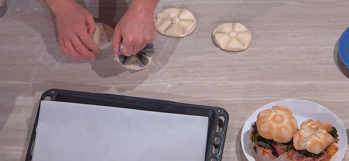 Stendiamo nuovamente con il mattarello ad uno spessore di circa 2 cm. Ricaviamo dei dischi di circa 10 cm di diametro. Li posizioniamo su una teglia ed imprimiamo in superficie in disegno, usando un tagliamela. Copriamo e lasciamo riposare ancora 40 minuti.