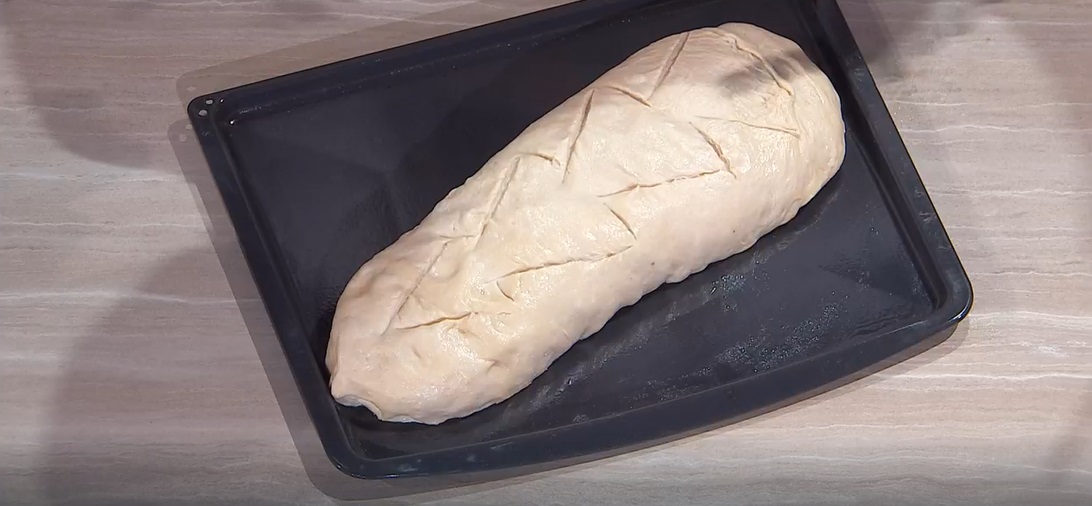 Riprendiamo l’impasto lievitato e formiamo un filone, che posizioniamo su una teglia, copriamo e lasciamo lievitare 1 ora e mezza a temperatura ambiente.