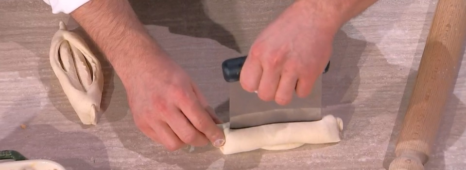 Con il mattarello, stendiamo ciascuna sfera, in modo da ottenere una lingua. Arrotoliamo quest’ultima su se stessa, partendo dal lato corco. Ottenuto un rotolino sottile, incidiamo al centro, per il lungo, con il tarocco. Li disponiamo su una teglia, li copriamo e li lasciamo lievitare ancora 40 minuti.