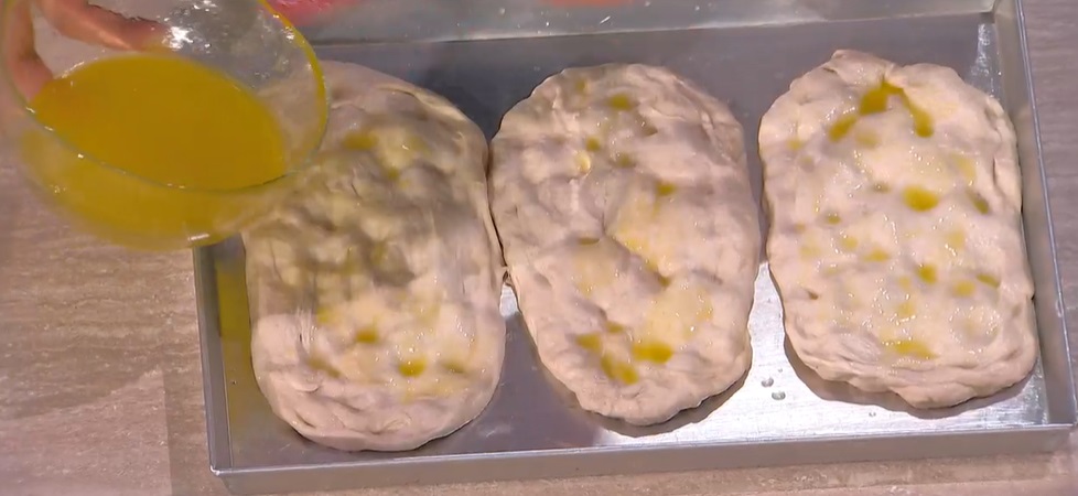 Sul piano infarinato, con le mani, stendiamo ciascun panetto, formando come delle lingue. Le posizioniamo su una teglia oliata. Spennelliamo con la salamoia di acqua, olio e sale. Copriamo e lasciamo lievitare fino al raddoppio. Spolveriamo con sale grosso e cuociamo in forno caldo e statico a 250° per 25 minuti.