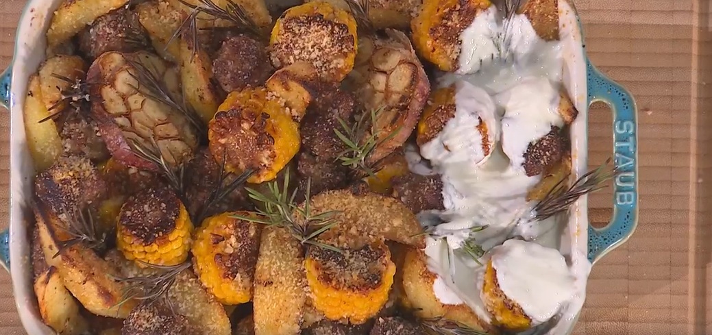 In una pirofila, mettiamo le patate, la salsiccia e le pannocchie. Aggiungiamo del rosmarino, una teglia d’aglio tagliata a metà, spolveriamo con del pangrattato, del formaggio grattugiato e del burro fuso. Cuociamo in forno caldo a 180° per 20 minuti.