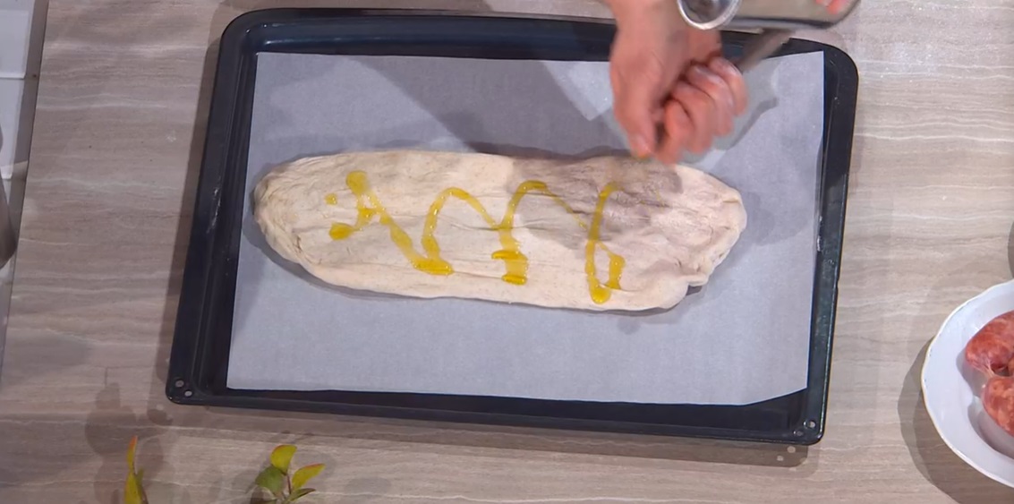 Allunghiamo ogni panetto con le mani, schiacciandolo come fosse una focaccia, dando la forma di una lingua. Spennelliamo la superficie con dell’olio e cuociamo in forno caldo e statico a 250° per 12 minuti.