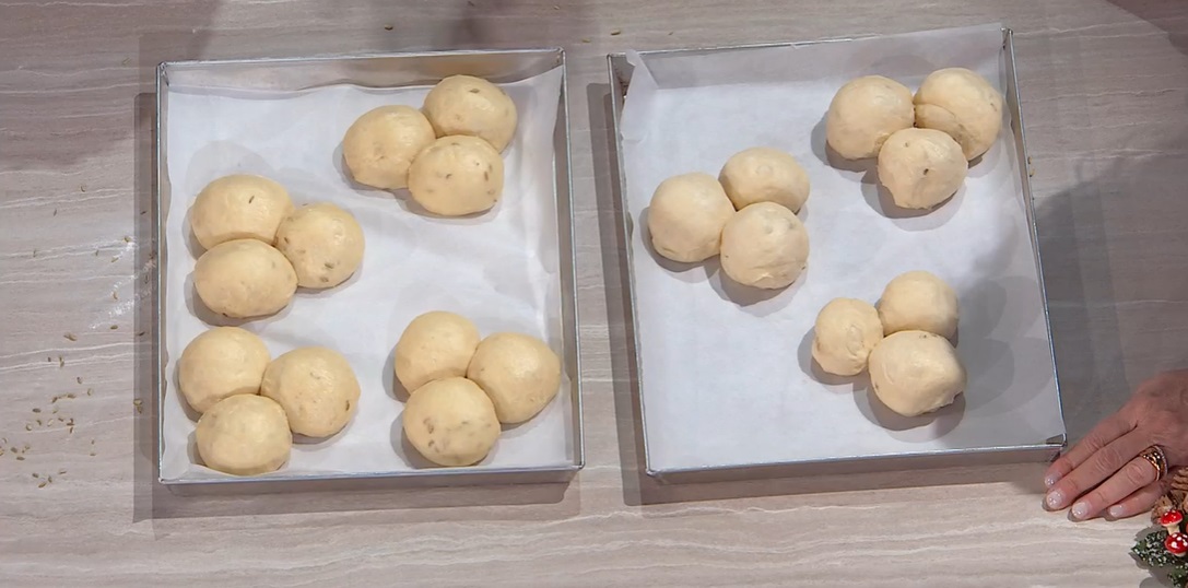 Dividiamo l’impasto in palline di 30-40 g, che lisciamo ripiegandole su loro stesse. Le posizioniamo sulla teglia con carta forno, unendole 3 per volta (foto). Copriamo e lasciamo lievitare 1 ora e mezza a temperatura ambiente.
