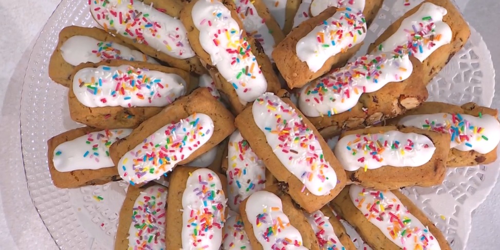 Una volta pronti i biscotti, immergiamo la superficie dei biscotti nella glassa, quindi li disponiamo sulla teglia e li spolveriamo subito con i diavolini colorati. Rimettiamo nel forno ancora caldo, a circa 70°, per circa 5 minuti (in questo modo pastorizziamo l’albume).