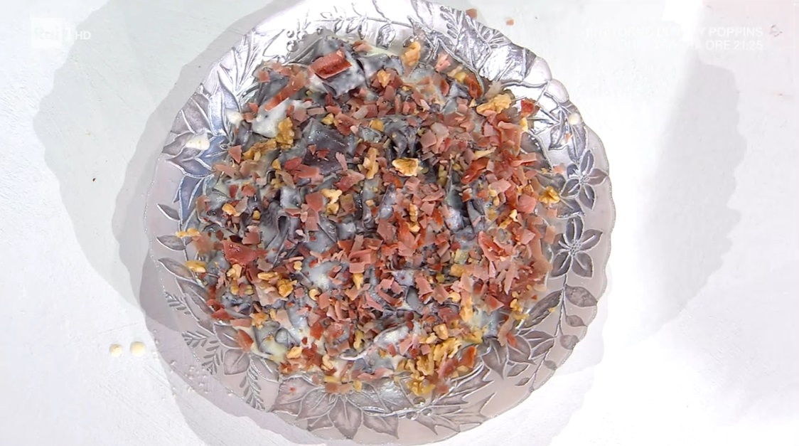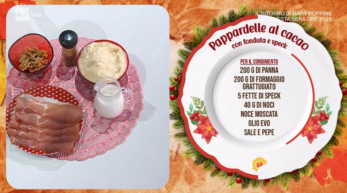 pappardelle al cacao con fonduta e speckFederico Fusca, che col nuovo anno sfoggia una chioma sempre più ossigenata, torna in cucina per preparare un primo piatto dal sapore festivo. Ecco le pappardelle al cacao con fonduta e speck.