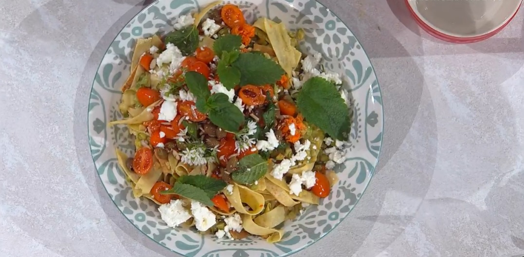 pappardelle di riso di Sergio BarzettiSotto l’occhio incuriosito dell’ospite in studio, una splendida Alessia Mancini, arriva in cucina Sergio Barzetti. Il re dei risotti, oggi, accantona il classico della cucina milanese per preparare un primo piatto senza glutine, a base di farina di riso. Ecco le pappardelle di riso.