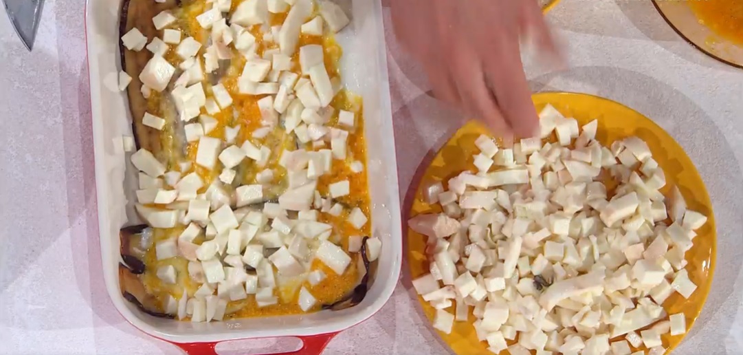 parmigiana di melanzane in bianco di Antonio PaolinoOgni scarrafone è bell’a mamma soja‘, si dice dalle sue parti, ma Antonio Paolino è bello e bravo per la mamma e non solo. In questi mesi, il pubblico di Rai1 ha imparato ad apprezzarlo ed amarlo, anche per le sue proposte culinarie mai banali. Oggi tocca alla parmigiana di melanzane in bianco.
