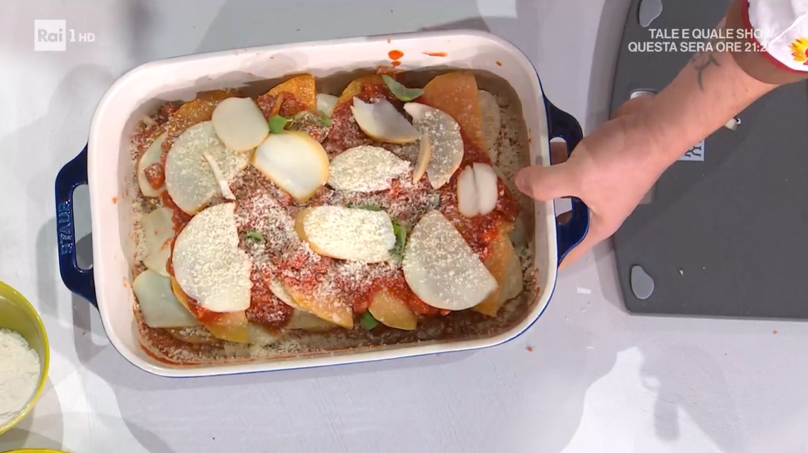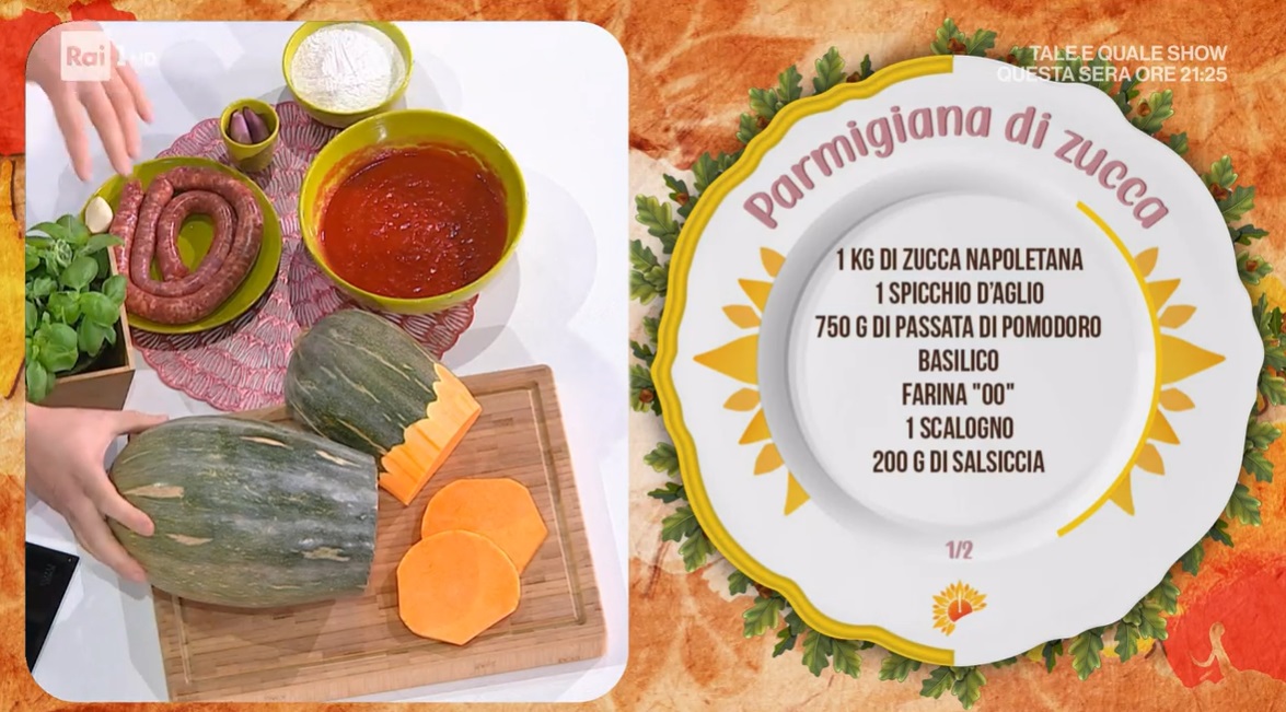 parmigiana di zuccaLa cucina ‘esagerata’ di Simone Buzzi torna protagonista, nonostante la ‘povera’ Evelina sia appena tornata da un convegno sulla buona alimentazione. Il cuoco romano prepara una versione inedita della classica parmigiana, ovvero la parmigiana di zucca.