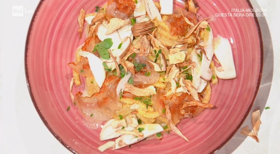 Serviamo i passatelli con il sugo, i porcini marinati ed il guanciale croccante.