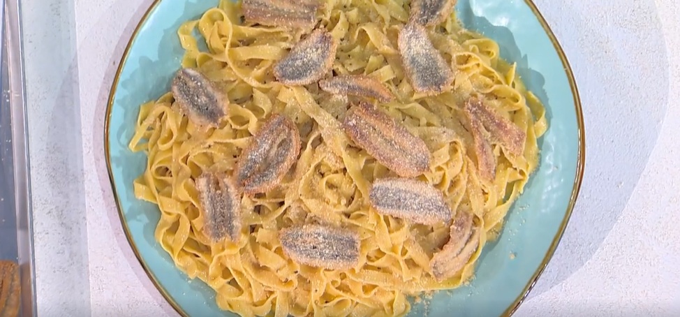 Scoliamo le tagliatelle e le saltiamo con il burro alle acciughe, aggiungendo anche poca acqua di cottura. Le serviamo con sopra le acciughe fritte, germogli ed una spolverata di pangrattato tostato.