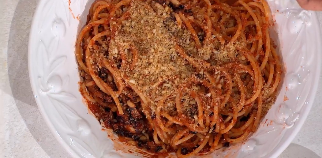 - 300 g bucatini, 150 g concentrato di pomodoro, 30 g acciughe salate, mezza cipolla, 1 spicchio d’aglio, 100 g pangrattato, uva passolina, una manciata di pinoli, olio evo, sale e pepe