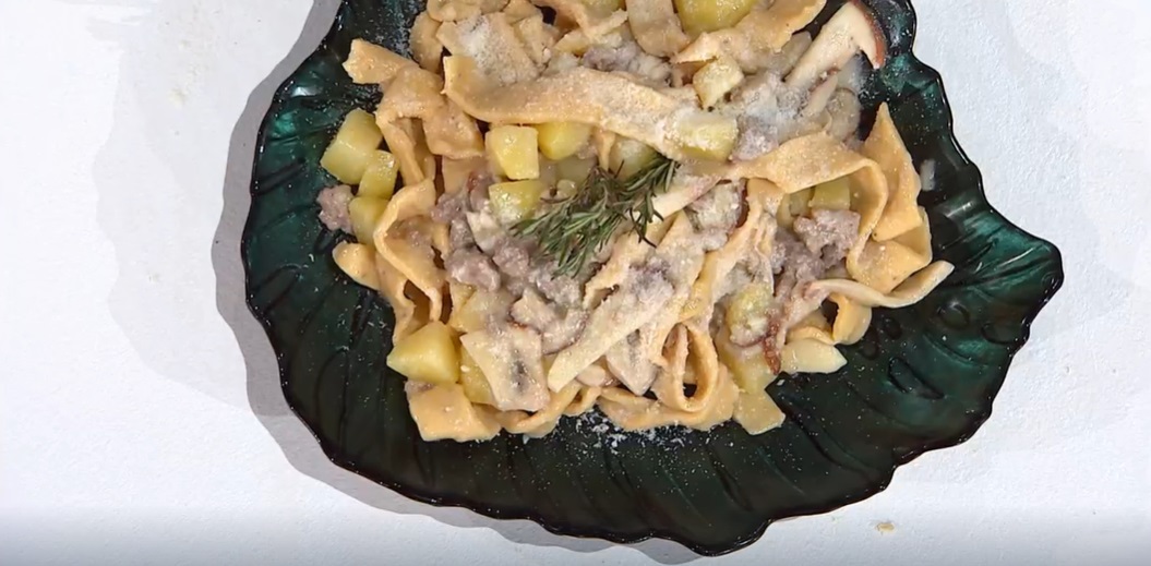 In padella, scaldiamo un filo d’olio con gli spicchi d’aglio e la salsiccia sgranata. Uniamo i porcini tagliati a listarelle e lasciamo rosolare. Scoliamo le pappardelle e le patate e le uniamo al condimento. Lasciamo insaporire qualche istante. Finiamo con del pecorino grattugiato.
