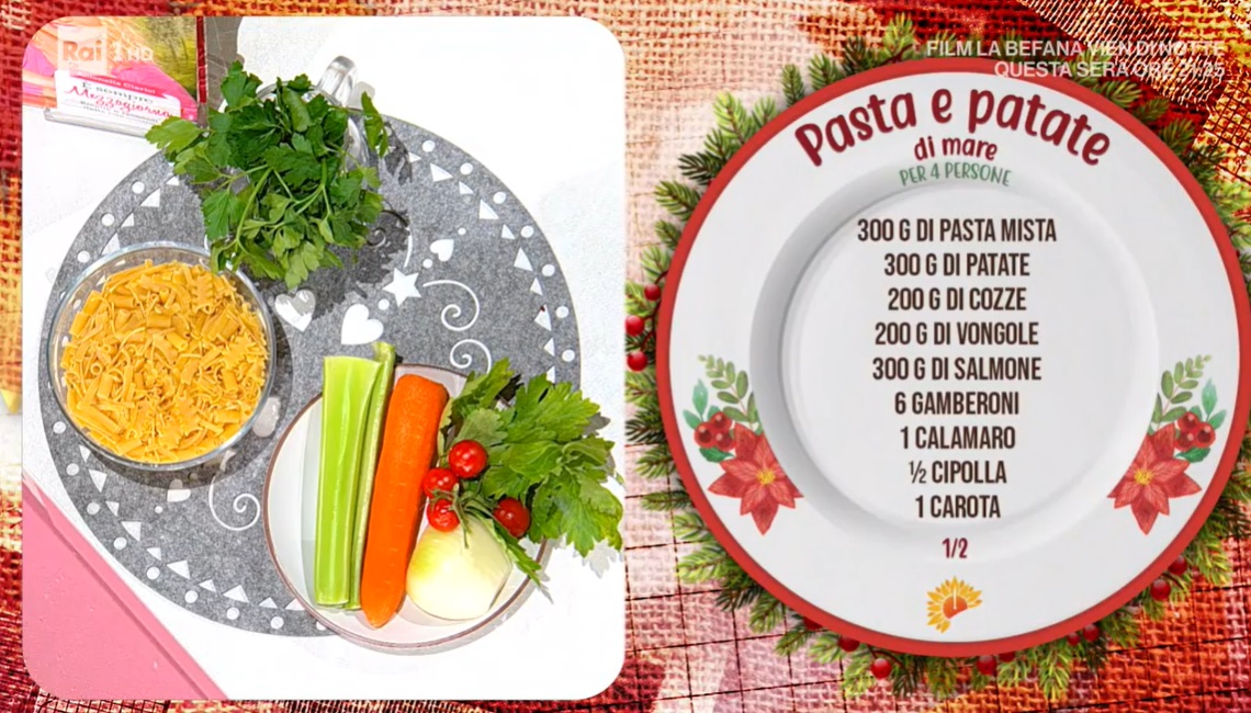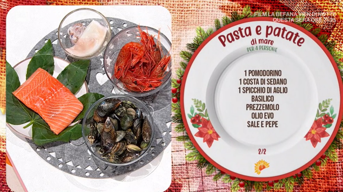 pasta e patate di mare di Mauro ImprotaMauro e Mattia Improta portano il sole di Napoli nello studio stretto nella morsa del freddo del bosco e di Milano. I due, padre e figlio, snocciolano il racconto del Natale trascorso in casa Improta e preparano un piatto contenuto anche nel libro di Antonella, da titolo E’ sempre mezzogiorno. Ecco la pasta e patate di mare.