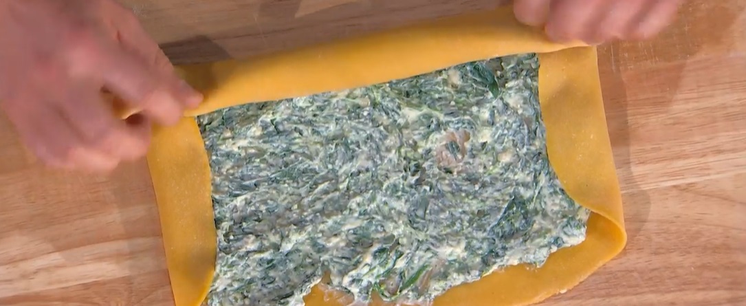 Stendiamo la pasta all’uovo sottile, creando un rettangolo. Spalmiamo sopra la farcia di spinaci e ricotta. Arrotoliamo la sfoglia sul ripieno, creando un rotolone. Avvolgiamo quest’ultimo in un canovaccio pulito (senza ammorbidente) e lo leghiamo alle estremità. Immergiamo in acqua bollente e lasciamo bollire dolcemente per 40 minuti, coperto.