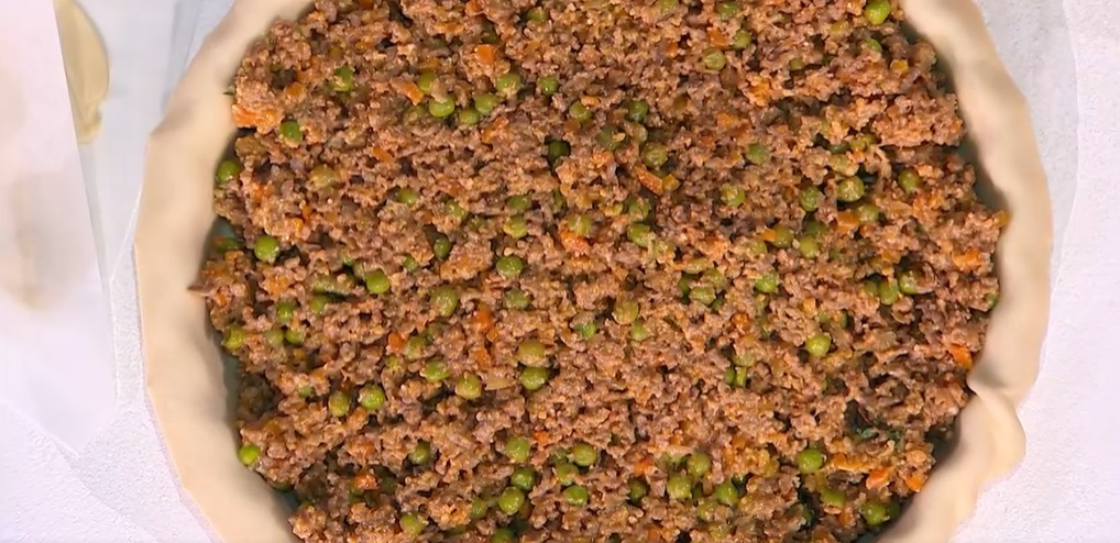 Stendiamo 2/3 dell’impasto (che abbiamo ottenuto lavorando la farina con lo strutto e l’acqua fredda) e usiamo la sfoglia ottenuta per foderare il fondo ed i bordi di una tortiera. Versiamo all’interno il ripieno di carne, lo livelliamo e copriamo con l’altro disco di pasta (1/3 avanzato). Sigilliamo bene i bordi e creiamo, al centro della torta, un foro.