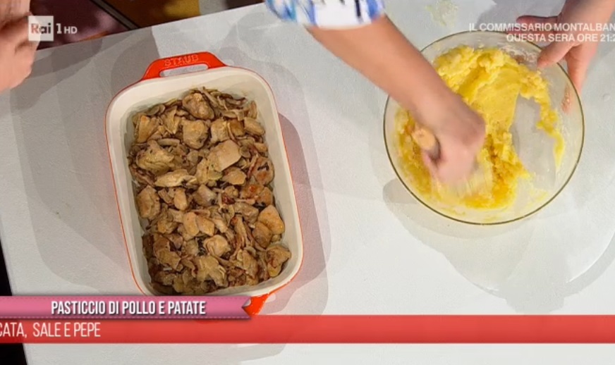 Distribuiamo la spadellata di pollo e funghi all’interno di una pirofila. Copriamo con il composto di patate, spolveriamo con parmigiano grattugiato e distribuiamo sopra il burro rimasto in fiocchi. Passiamo in forno caldo e statico a 180° per 20 minuti.