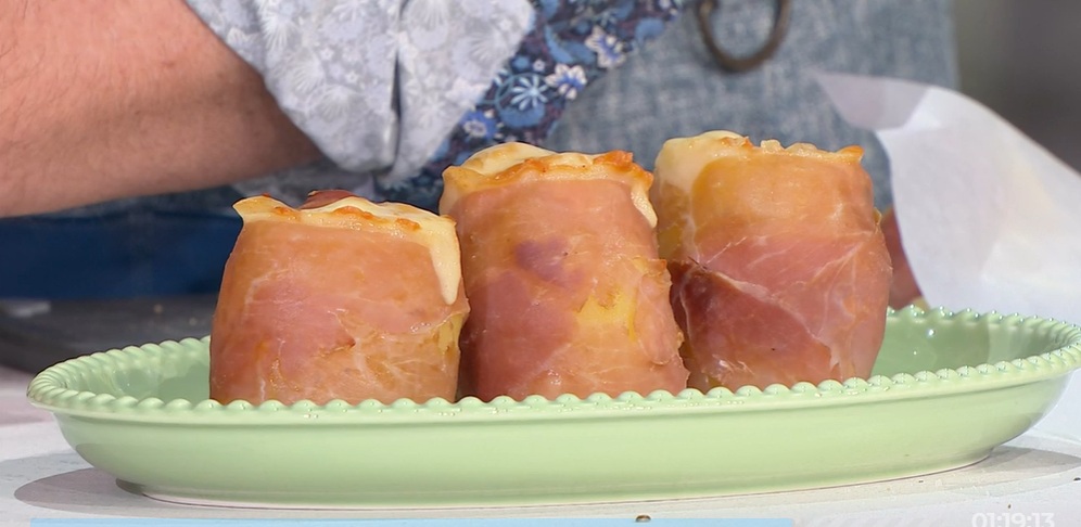 Avvolgiamo ciascuna patata in una fetta di prosciutto crudo (o speck, o cotto) e mettiamo all’interno un po’ di provola grattugiata, sopra il tuorlo crudo e finiamo con altra provola grattugiata. Mettiamo in forno già caldo a 200° per 7-8 minuti.