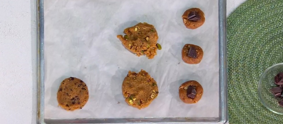 Dividiamo l’impasto ottenuto in tre parti uguali: ad una aggiungiamo le gocce di cioccolato; ad un’altra parte i pistacchi sgusciati e salati; all’ultima parte, invece, non aggiungiamo niente.
