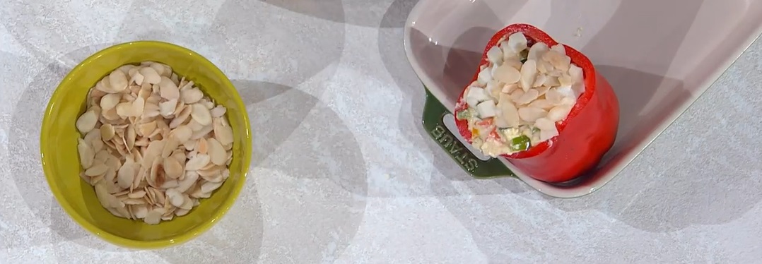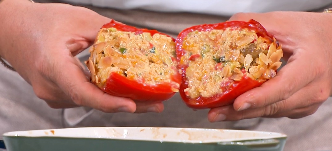 Farciamo i peperoni puliti con il ripieno di ricotta e verdure. Li disponiamo, in piedi, all’interno di una pirofila e, sulla sommità, mettiamo dalla mozzarella tritata e delle mandorle a lamelle. Versiamo il vino bianco alla base della pirofila e cuociamo in forno caldo e statico a 180° per 40 minuti. Li serviamo tiepidi.