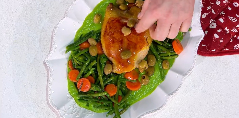 Serviamo la faraona su un letto di crema di piselli, con il contorno di fagiolini e carote.