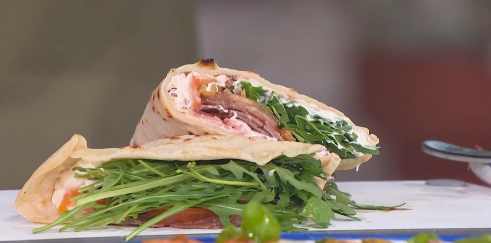 Farciamo ciascuna piadina in questo modo: spalmiamo un velo di crescenza, quindi disponiamo sopra l’arrosto affettato, i pomodori crudi conditi, della rucola e chiudiamo a mezzaluna. Serviamo con il fondo.