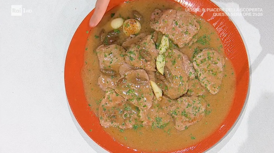 Al fondo di cottura (il burro), aggiungiamo gli spicchi d’aglio, i capperi e sfumiamo con il vino bianco. Aggiungiamo il burro a tocchetti (80 g) e mescoliamo con una frusta o una forchetta, in modo da creare un’emulsione. Uniamo nuovamente le fettine di carne precedentemente fritte. Sfumiamo con il succo di limone e l’acqua e, dopo qualche minuto, serviamo con prezzemolo tritato.