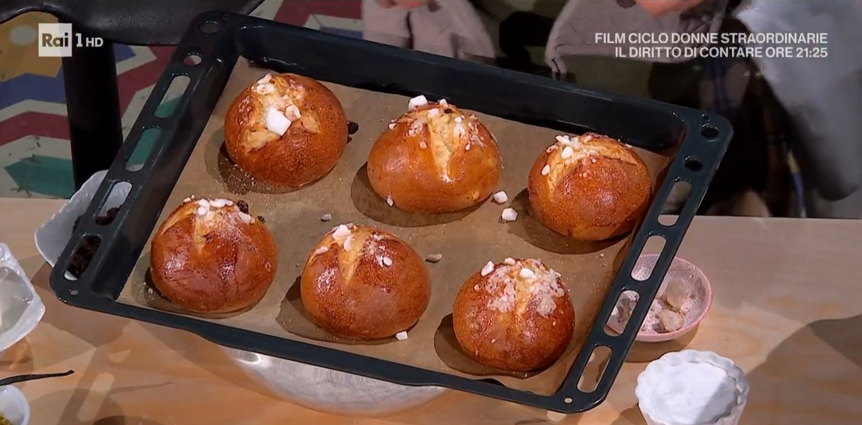 Con le forbici, disegniamo una croce sulla sommità delle brioche. Spolveriamo con le zollette di zucchero frantumate e cuociamo in forno caldo e statico a 170° per 30 minuti.