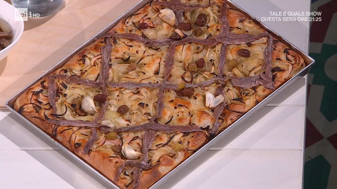 Trasferiamo l’impasto su un piano infarinato, lo dividiamo in due parti, per ottenere due teglie di focaccia. Ripieghiamo ogni parte su se stessa e la posizioniamo su una teglia unta con abbondante olio. Copriamo e lasciamo riposare per 30 minuti. Allarghiamo l’impasto all’interno della teglia con le mani. Aspettiamo 30 minuti, quindi allarghiamo ancora l’impasto con le mani, fino a raggiungere i bordi della teglia. Copriamo e lasciamo lievitare ancora 1 ora a temperatura ambiente. Distribuiamo sopra le cipolle stufate e fredde (le lasciamo cuocere dolcemente con un filo d’olio, senza sale), le acciughe, che disponiamo sulla cipolla in modo da disegnare una scacchiera, spicchi d’aglio in camicia (che poi toglieremo), e le olive nere. Cuociamo in forno caldo e statico a 250° per 15-20 minuti, a metà forno.