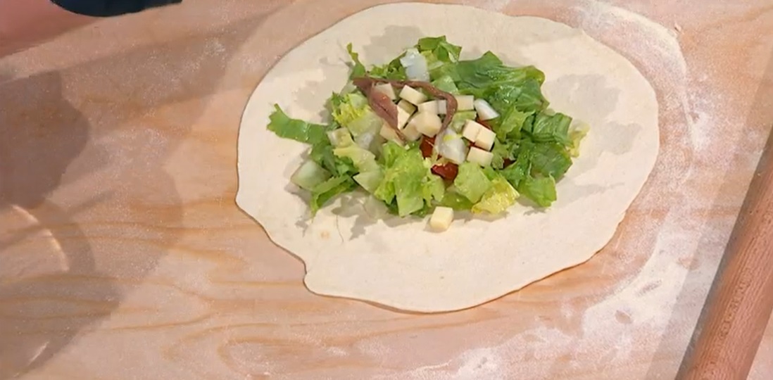 Con il mattarello, assottigliamo ogni panetto, in modo da ottenere dei dischi sottili. Su ogni disco mettiamo un po’ di scarola condita con pomodorini a pezzetti, olio e sale, aggiungiamo dadini di tuma o primosale e filetti di acciughe. Richiudiamo il disco sul ripieno, a mezzaluna, sigillando bene i bordi (li ripieghiamo su loro stessi).