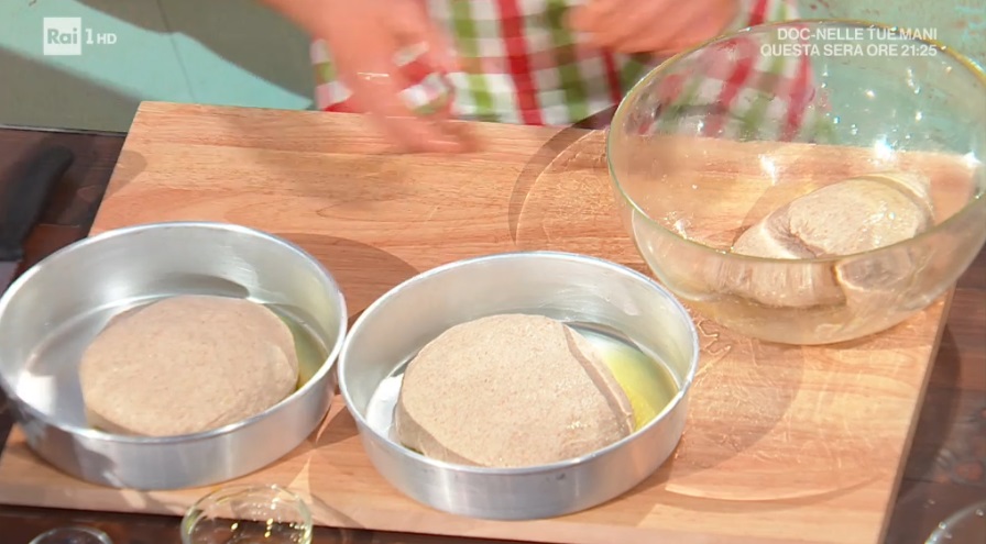 Formiamo delle palline da 500 g e le mettiamo all’interno delle teglie (simili a tortiere) ben unte d’olio. Allarghiamo leggermente con le dita all’interno della teglia, copriamo con la pellicola e lasciamo riposare per 45 minuti al caldo.