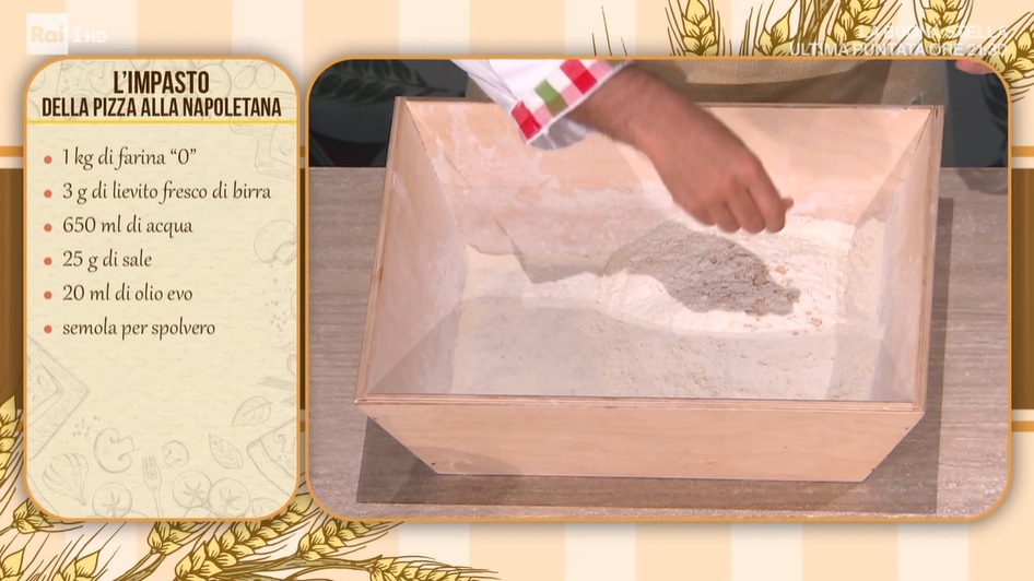• 1 kg farina tipo 0, 3 g lievito di birra fresco, 650 ml acqua, 25 g sale, 20 ml olio, semola per spolvero