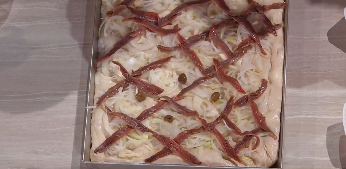 Copriamo l’impasto con la cipolla cruda affettata e scondita. Disponiamo sulla cipolla le acciughe sott’olio, a disegnare una griglia. Finiamo con le olive ed i capperi. Cuociamo in forno caldo e statico a 250° per 15 minuti.