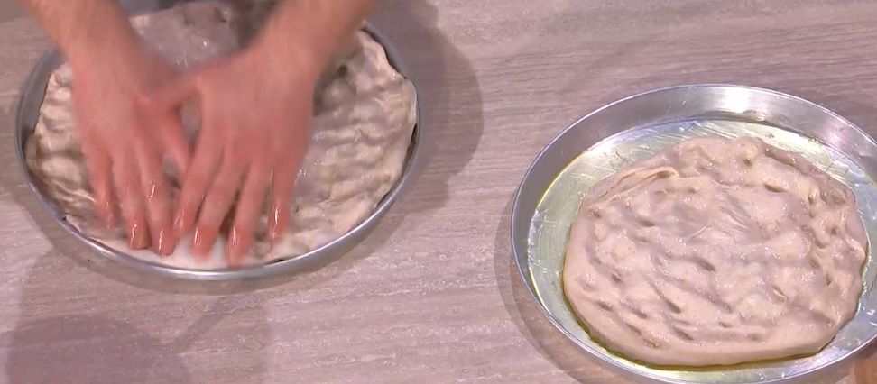 Trasferiamo ciascun panetto su una teglia da 28 ben oliata e lo stendiamo all’interno con le mani, fino ad arrivare i bordi (aspettiamo 30 minuti se l’impasto è troppo elastico).